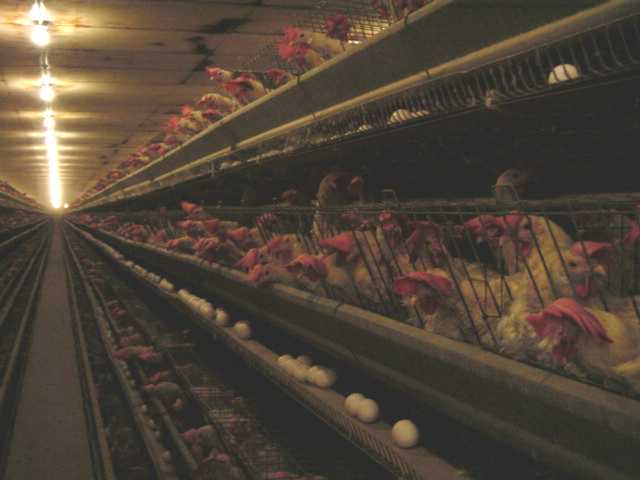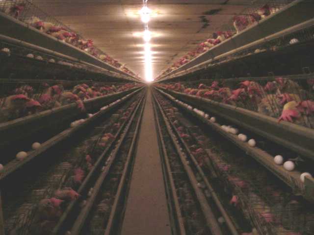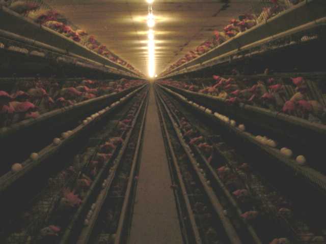 ウインドウレス鶏舎(無窓鶏舎:窓のない鶏舎)内