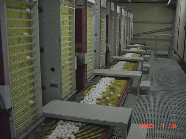 たくさんのたまごがウインドウレス鶏舎から自動的