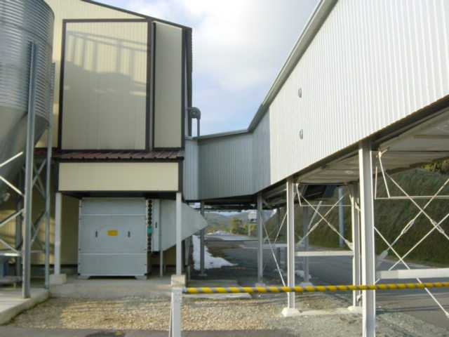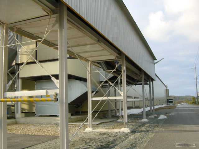 ローラーコンベアは、風雨を避けるため鶏舎外の