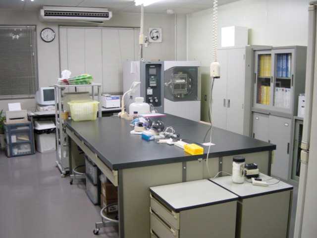 部屋の右奥の角に見える装置は、「凍結乾燥機」