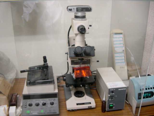 写真中央の光学顕微鏡には、記録用のカメラが