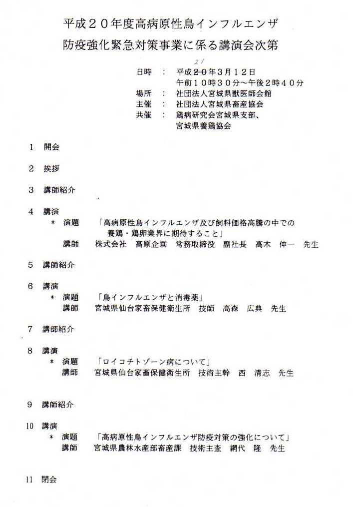 (183) 宮城県畜産協会 「平成20年度 AI防疫強化事業に係る講演会次第」 (平成21年3月12日開催)