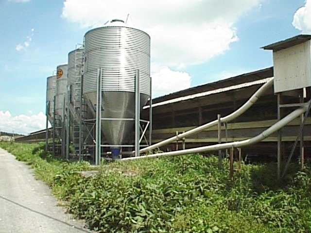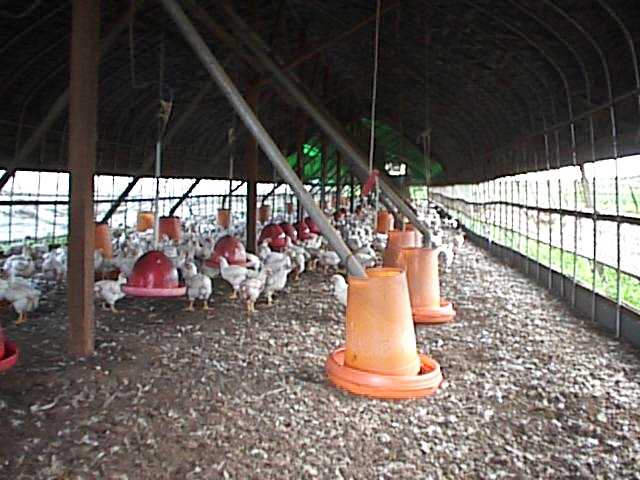 かまぼこ型の建物が鶏舎で、その建物に1つずつ