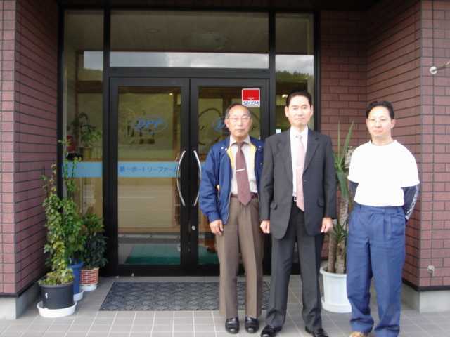 本社玄関前での記念撮影です。 写真左が高田 社長、右側が農場生産部(GP担当) の古川 係長で、中央が私(「たまご博物館」館長)で す。