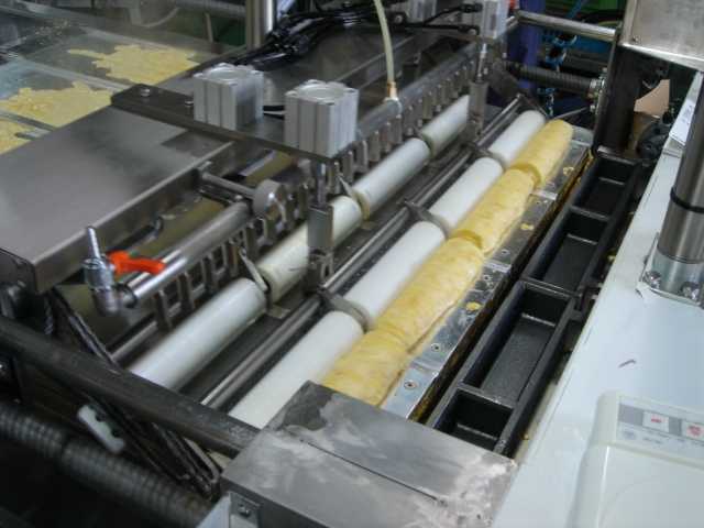 成型用の型枠に焼き上がったたまごを入れる瞬間