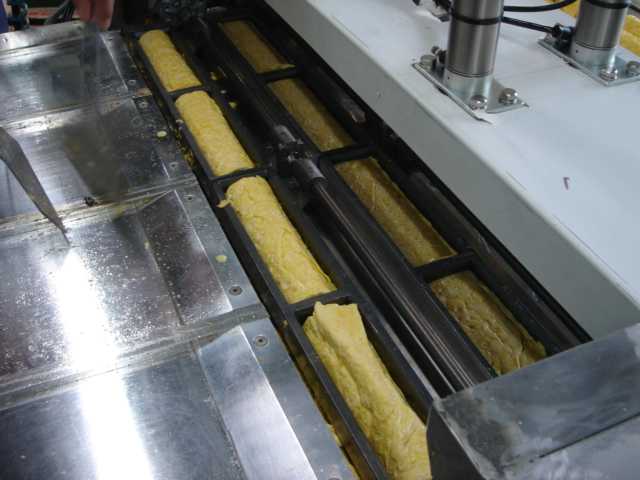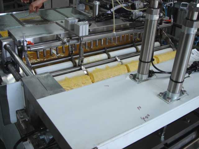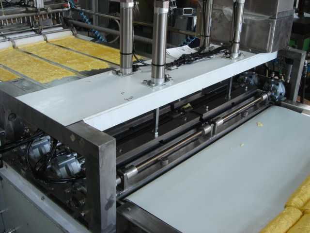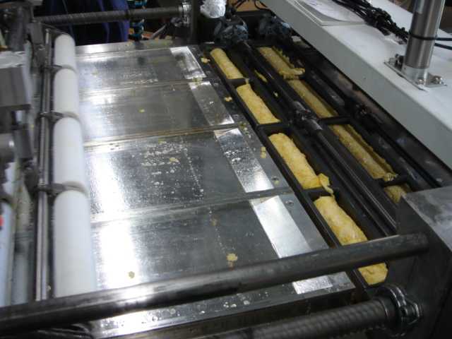 手前の焼きあがり出口のテーブルをベルトコンベア