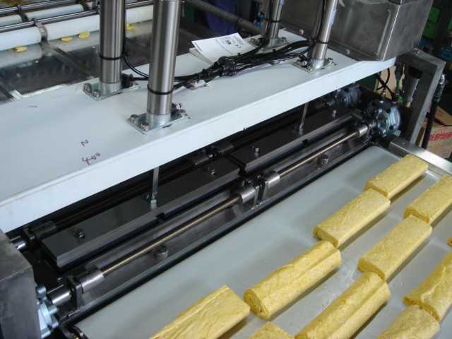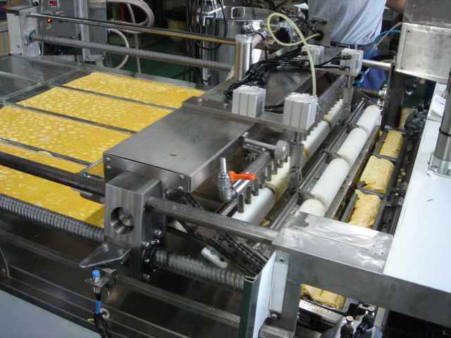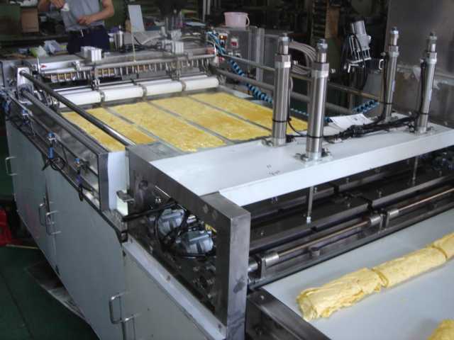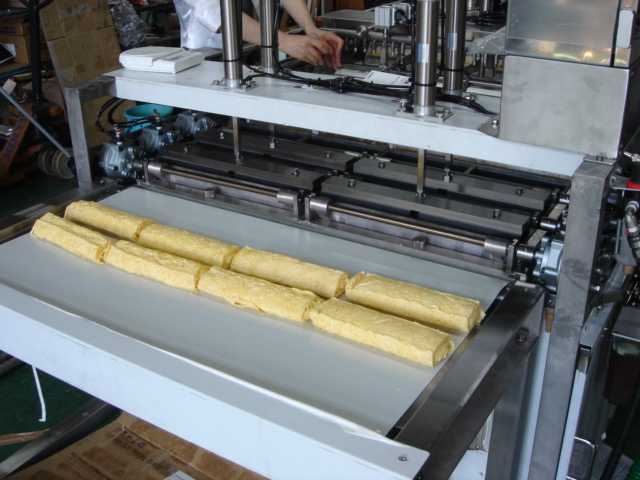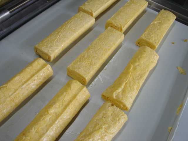 でだし巻きたまごの形を成型し、断面を四角い形に