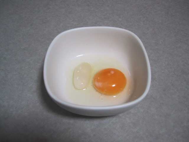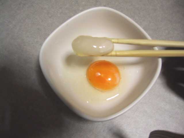 ここでは、異常卵(固形物混入卵)の画像を掲載しています。卵黄の隣に白いゼリー状の物体が確認できます。