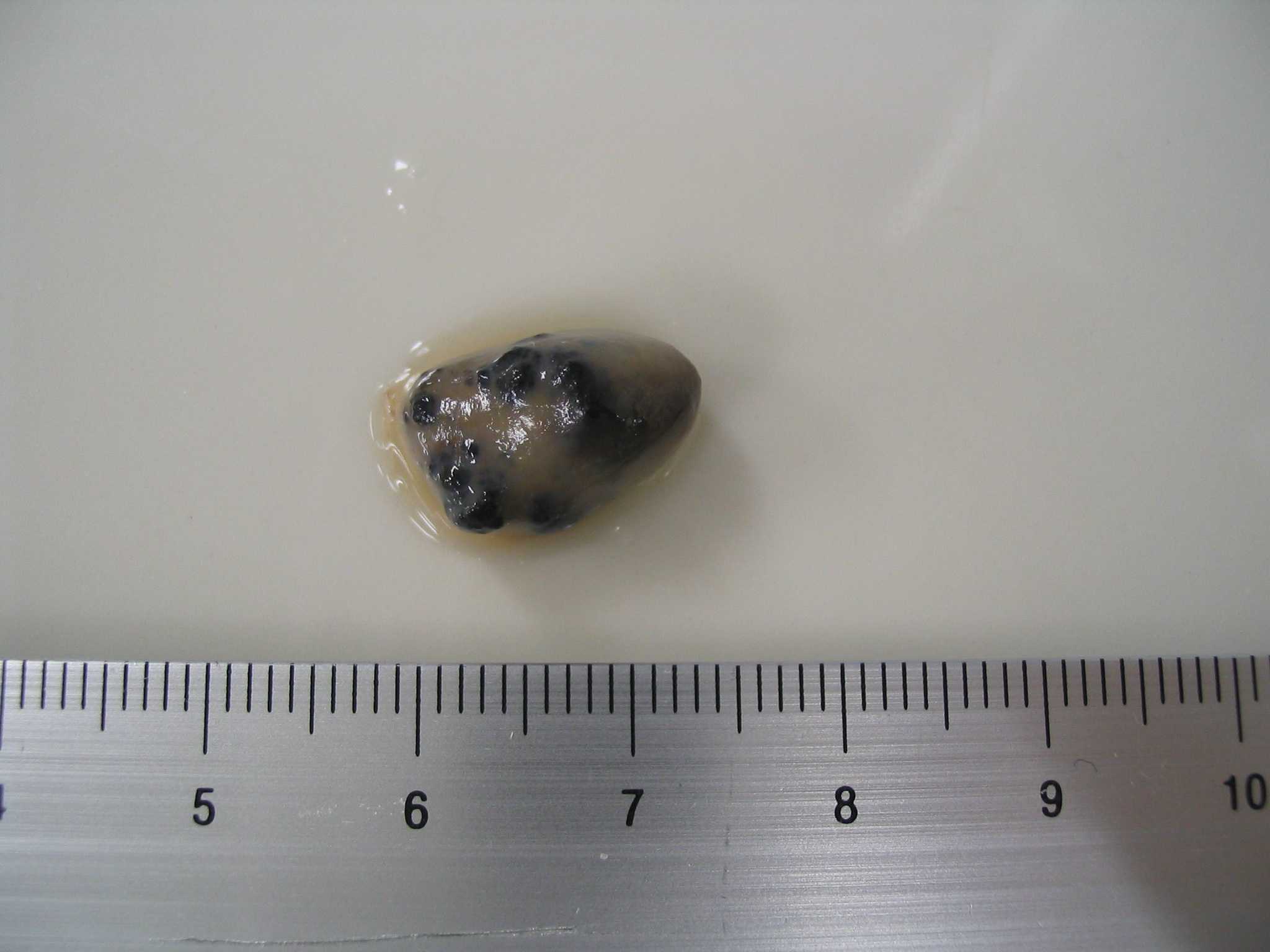 | 【調査依頼者の所見】 生卵の割卵時に卵白の部分に入っていた異物である。ピーナッツ大の灰色のかたまりに、黒いこぶ状のも のが出ている。ゴムのようなやや硬い弾力がある異物である。 【鶏卵加工メーカーの品質保証部門の所見】 典型的なミートスポットだと思われる。詳細は分析にかけてみると、よりはっきりわかると思うが、黒い斑点 部分はおそらく血液を含む固まりで、回りのどろんとした部分は、粘液・体液の部類ではないかと考えられ る。(以前、真っ黒な斑点を含む異物を分析したことがあり、血液を含む蛋白質類という分析結果であった) 分析にかけると、おそらくルミノール反応がでるのではないかと思われる。 |