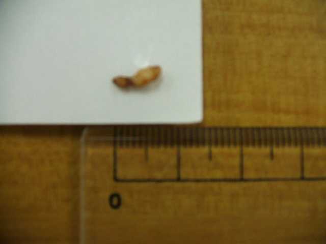 | *消費者から写真提供のあったもの たまごを割ると中から濃いベージュ色(茶色)をした小さな粒状の物体が数個出てきました。その1つは直 径が3mm、長さが8mm程度ありました。 【画像からの所見】 形状から考えて、先の9項のものと同じく「卵胞」(卵黄の基になるもの)に由来するものと推定されます。 産卵中の鶏の腹部にあるぶどうの房のような卵巣から、未成熟の卵胞が剥離したものが、正常な排卵で 形成された卵の中に混入したもとの考えられます。 |