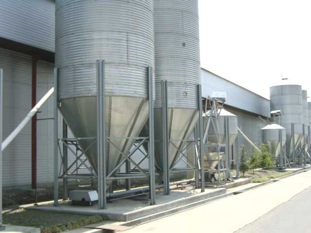 鶏舎の中へエサ搬送用のパイプが伸びていて、コン