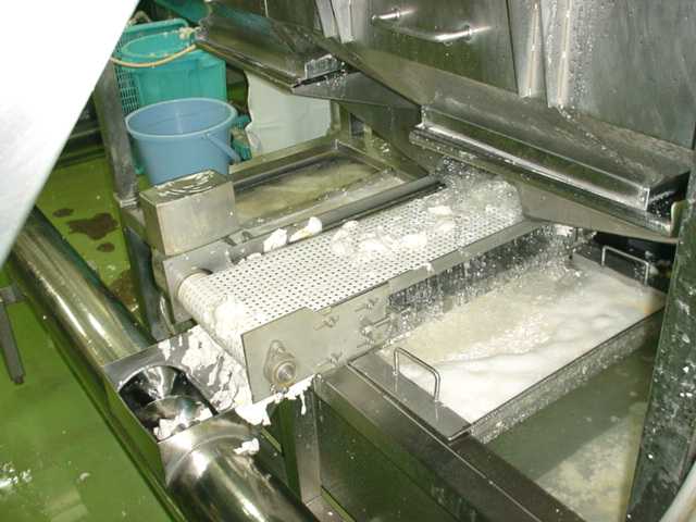 剥かれた殻は、コンベアから左下に見えるパイプの