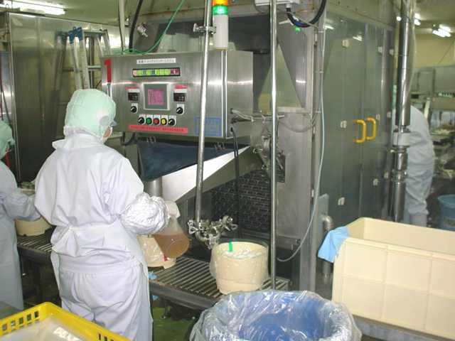 作業員がちょうどだし汁(調味液)を入れているとこ