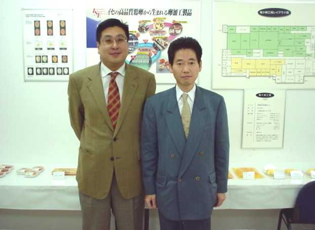 2K.11.10に鶏卵加工食品メーカーのイセデリカ(株) 竜ヶ崎工場を取材しました。 イセデリカ(株)は、コンビニエンスストア「セブンイレブン」をターゲットとしたパック入りたまご「ドキッ! と新鮮 こだわりたまご」やゆでたまごを中心とした各種の鶏卵加工食品のチルド製品を開発、製造、販売している会社です。(平成9年にイセ食品から分社) 写真の左が河岸 取締役、右が私(「たまご博物館」館長)です。