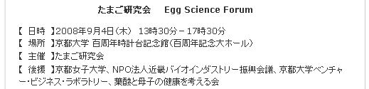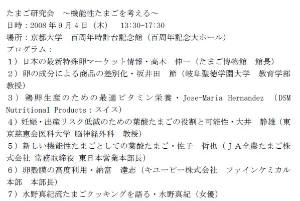・平成20年9月4日(木)に京都大学 百周年時計台記念館にて「たまご研究会 2008」が開催され、500名を超える聴講者が集まりました。主催は、