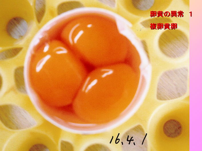 この画像は、1個のたまごの中に卵黄が3つ入って