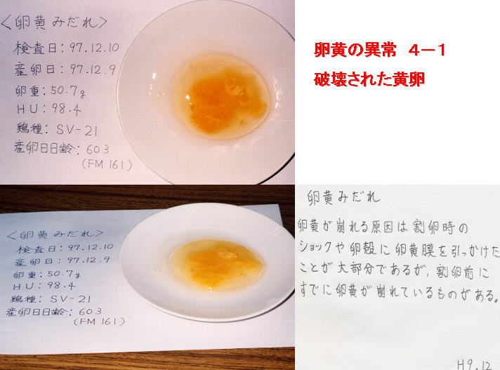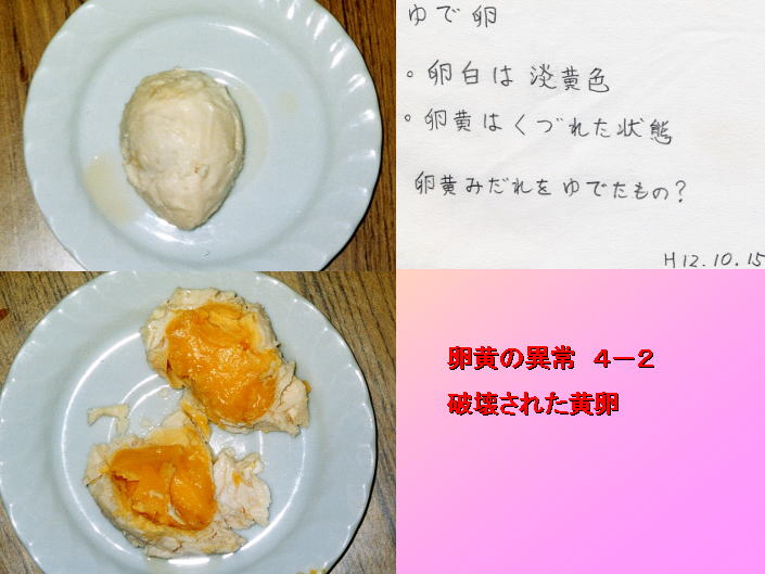 画像の下は、上のたまごを正常な卵黄と乱れた卵