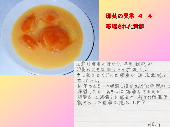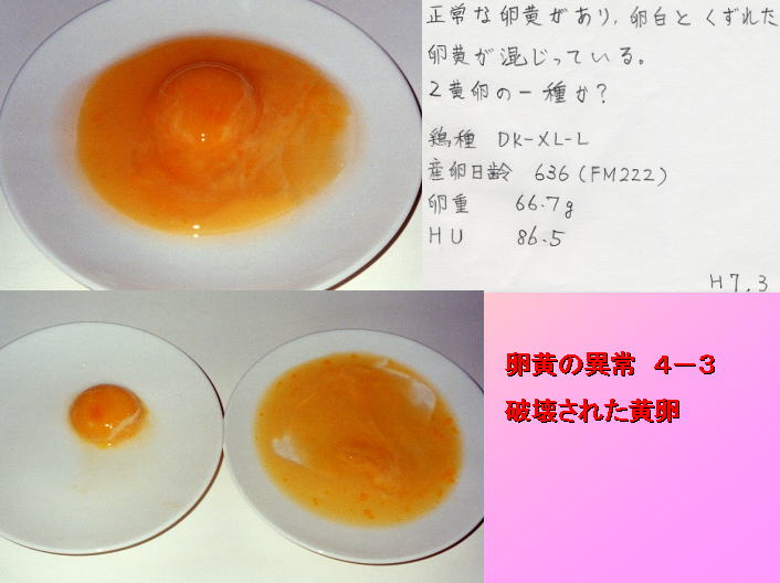 正常な卵黄と乱れた卵黄が混じっている異常卵の