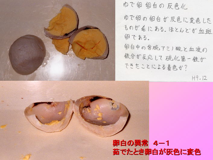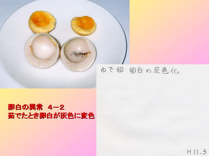 ゆでたまごの卵白が灰色に変化した例です。
