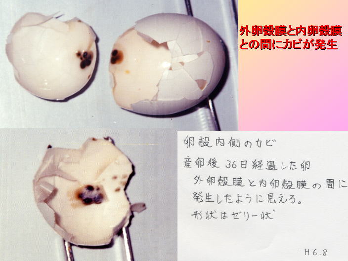 外卵殻膜と内卵殻膜の間に発生したカビの例です。