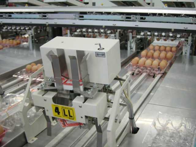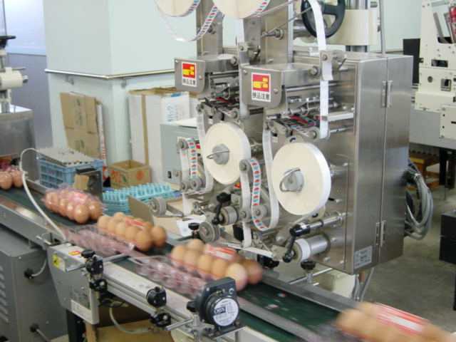 パックにセットされ、ラベルを入れたたまごがコンベ