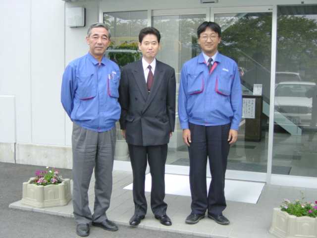 平成13年10月13日にGPマシン(洗卵選別包装機械)の製造、販売で国内最大シェアを有する「(株)ナベル」(所在地:京都府長岡京市)の見学が実現しました。 写真の向かって左側が南部 邦男 社長、右側が南部 幸男 営業部長です。中央が私「たまご博物館 館長」です。 (京都府長岡京市のナベル本社前にて撮影) *NABEL社工場見学の様子は、こちらの「施設見学コース」に「GPマシン製造工場」(項番31、32)として掲載しています。