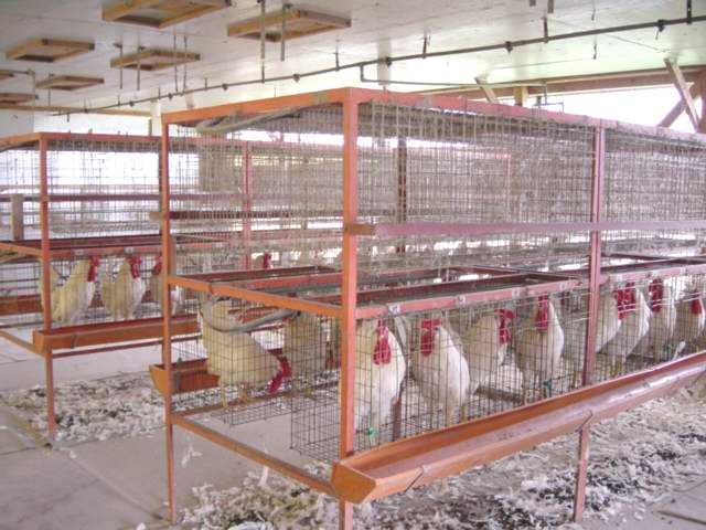 ずつ仕切られたケージ(カゴ)に入れられて飼育され