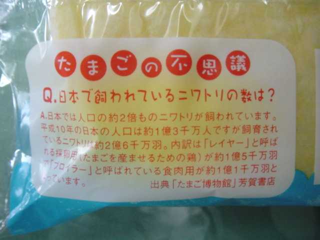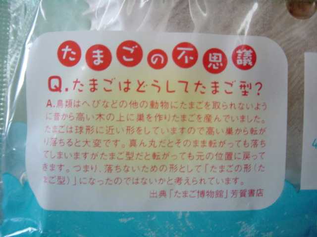 ・このパンは、敷島製パン(株) パスコ湘南工場(神奈川県高座郡寒川町)で製造されている菓子パンで、「Pasco」(パスコ)のブランドで有名なパンです。今回、7種類の製品が発売され、そのパッケージ裏面に出版本「たまご博物館」の「たまごのQ&A 100」の中から「たまごの不思議」と題して掲載されています。