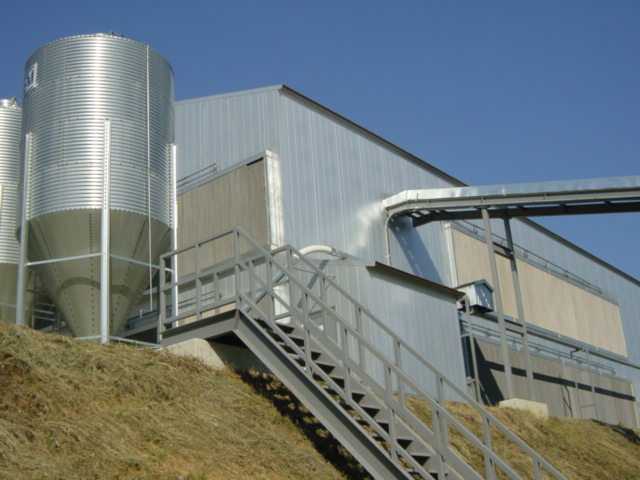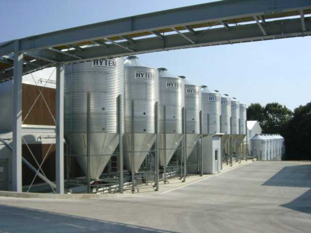 鶏舎とエサタンク(コマのような形のもの)が並ん