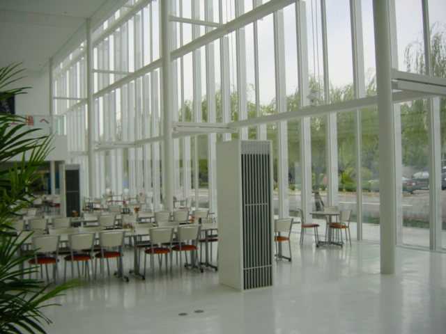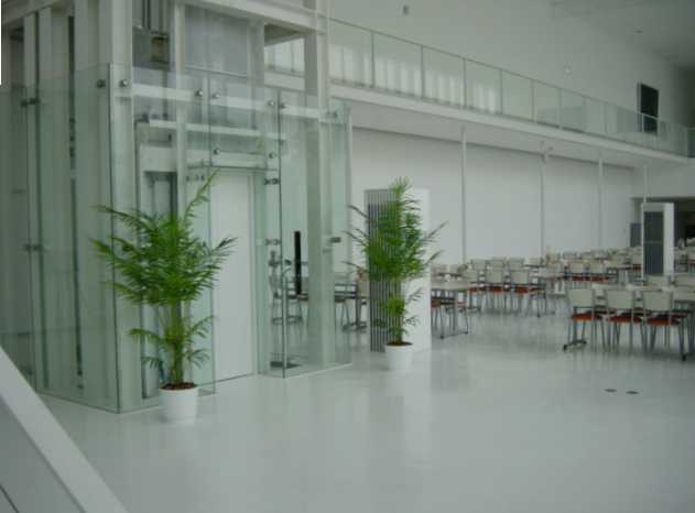 前面がガラス張りの美しいデザインの工場