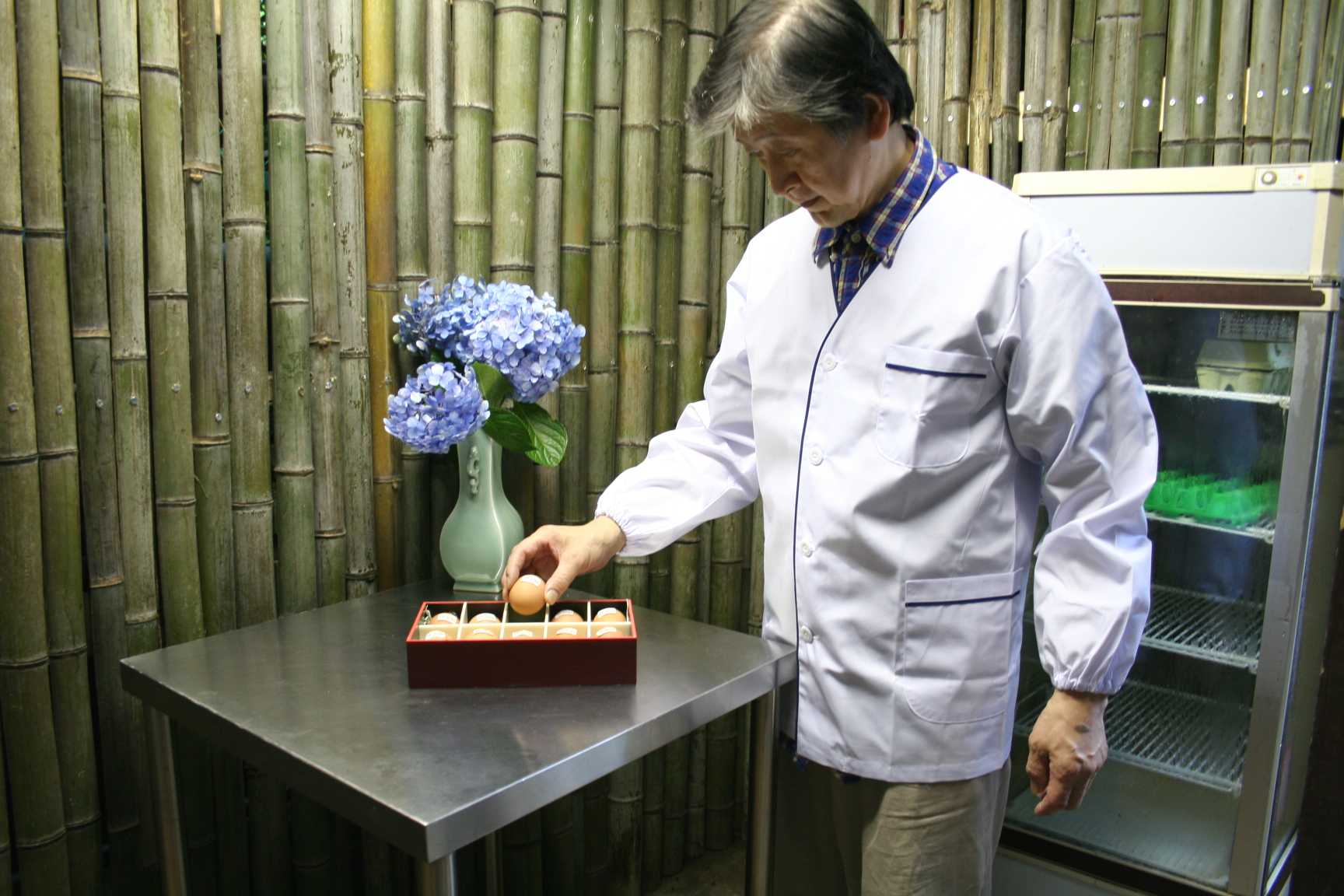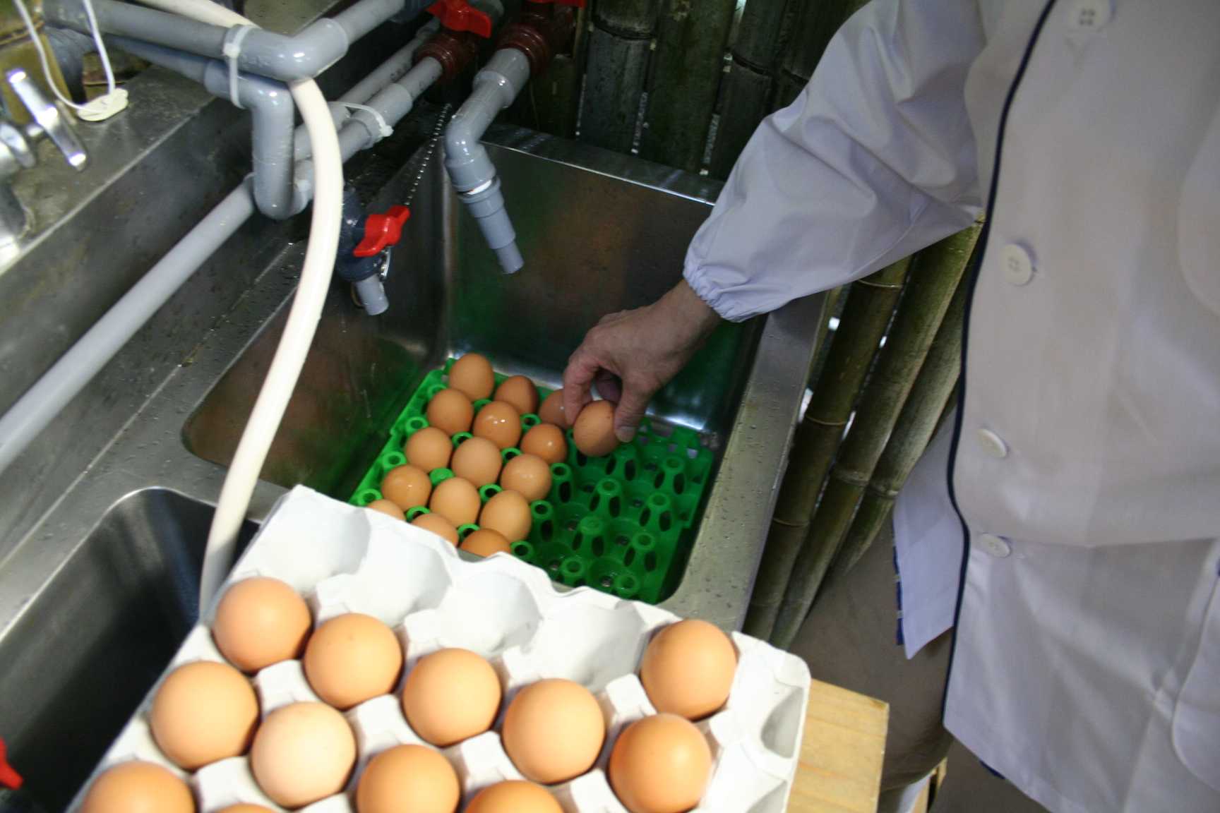 出来上がった温泉たまごを専用の箱に詰めているところ