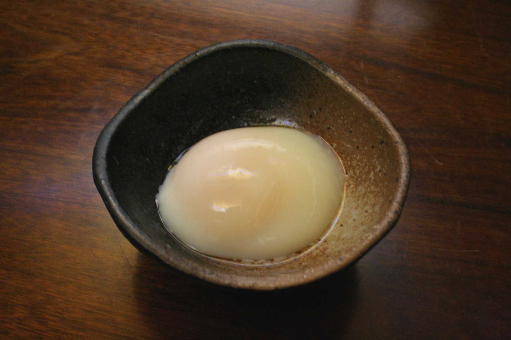 出来上がった温泉たまご「箱入り玉娘」を割ったところです。