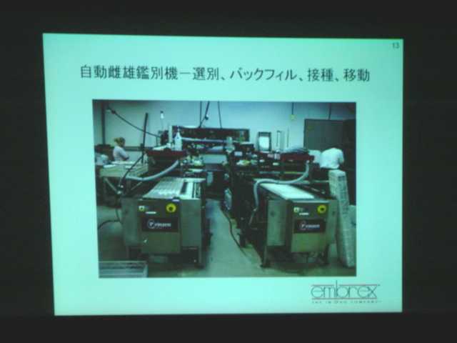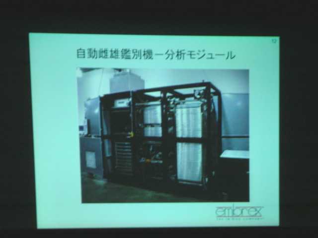 | 【自動雌雄鑑別機について】(ベインズ氏の講演内容および質疑応答より) ・現在、Embrex Inc.(エンブレックス社)にて実用化に向けて開発中であり、プロトタイプ機(テスト機)によるコマーシャル孵化場 でのロードテストを実施中である。2〜3年後の実用化を目指している。 ・孵卵開始後16日目に尿膜腔液を採取する。 ・抗体法を用いて、雌(メス)発育鶏卵由来のエストロゲンを検出する。(孵卵13〜16日目で検出可能となる)検出には数時間(2 〜3時間)を要する。 ・孵卵開始後18日目に発育鶏卵を自動雌雄鑑別機にて選別し、その後、イノボジェクトにてワクチンを卵内接種する。これにより、 レイヤーにおける雄ヒナへのワクチン無駄射ちを防止できる。 . |