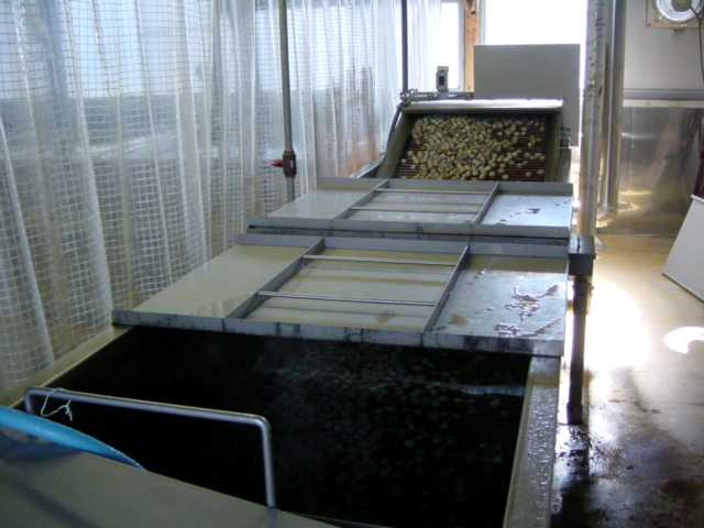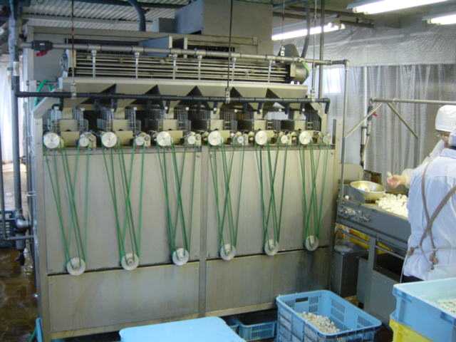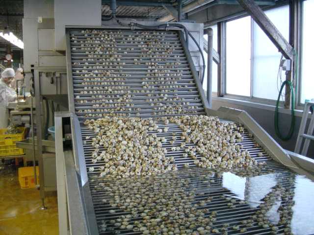 水槽から引き上げられて、殻剥き工程に向かう