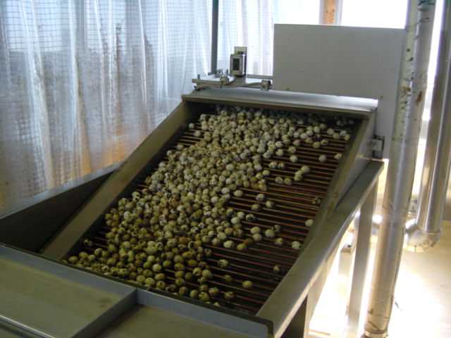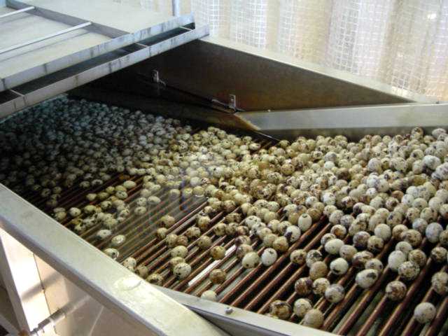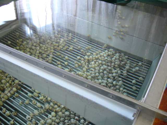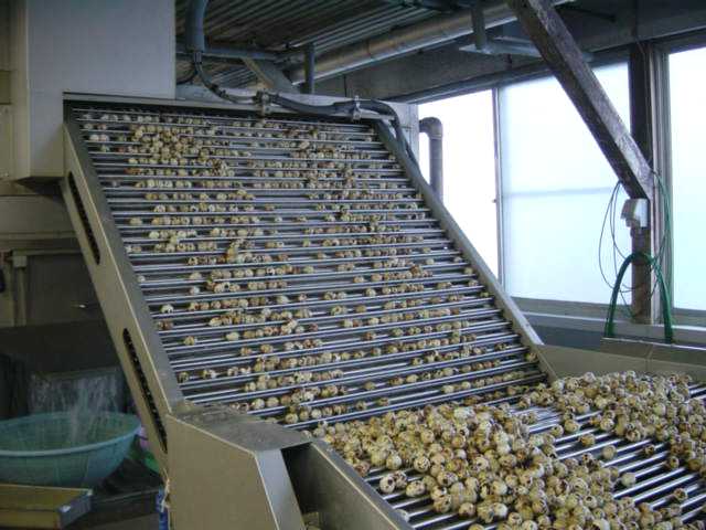 大量のウズラ卵が殻剥きマシン(写真の左側)に