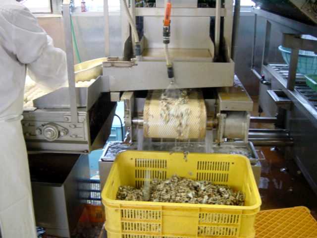 殻剥き機(写真の左奥)から出てきた殻を剥かれ