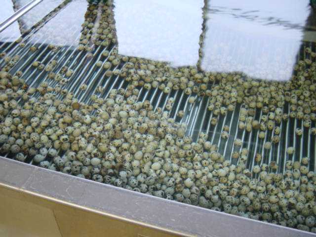 ウズラ卵は、バーコンベアにより写真の手前か