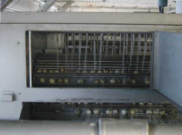 ウズラ卵は、ボイル装置の中を写真の奥から手前