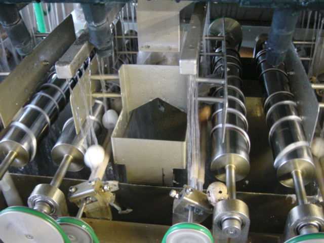 殻剥きマシンに入っていくウズラ卵の様子です。