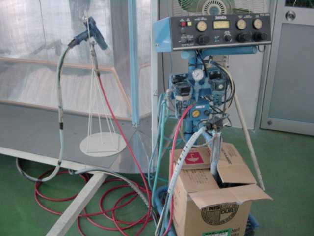 写真左側に見えるスプレーガンを使って部品に