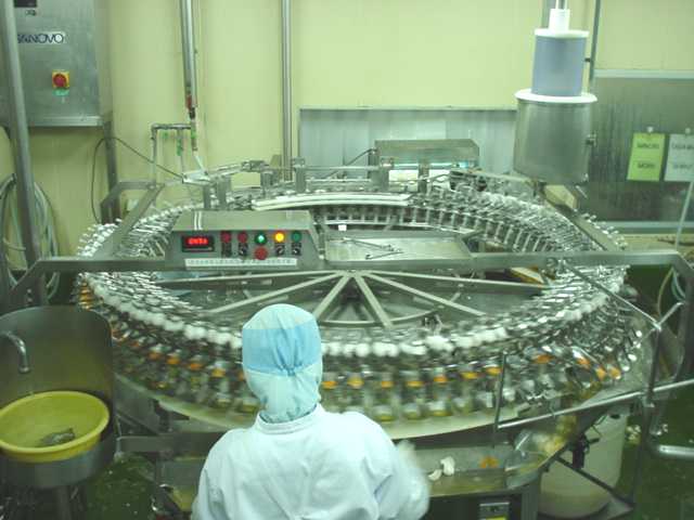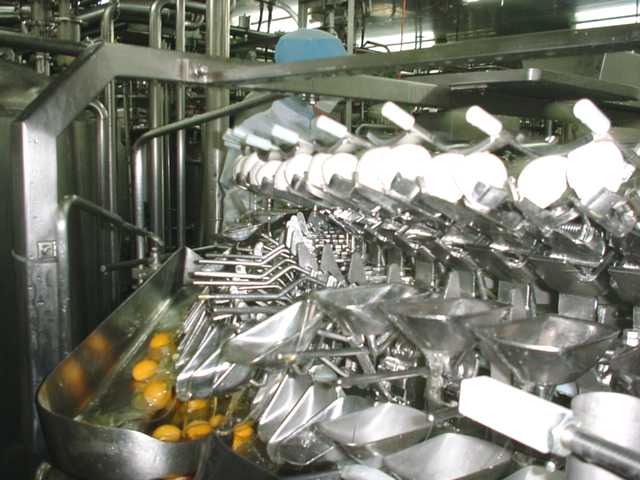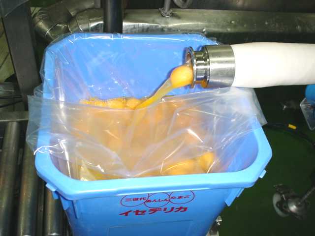 から液卵パックへのパック詰めが行われています。