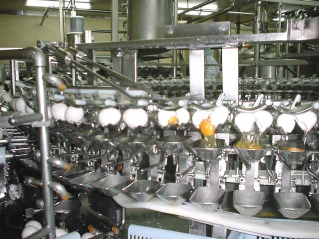 窓のコンベアから、たまごが高速自動割卵機